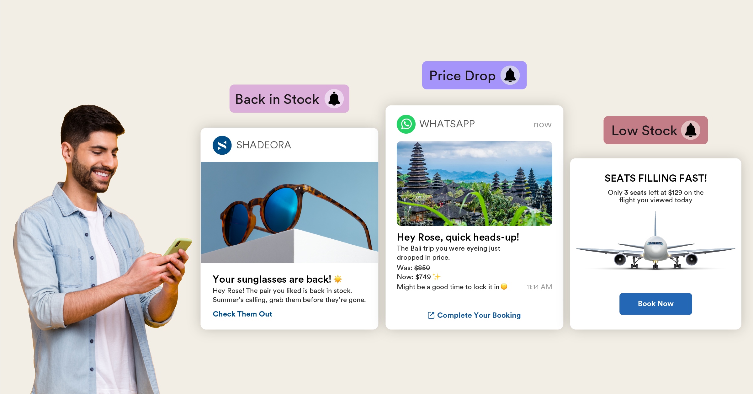 For example, a travel app can recommend a holiday package the customer viewed earlier that’s now available at a lower price. A fashion brand might highlight a pair of sunglasses the customer liked that’s back in stock. Similarly, an airline app can prompt the customer to book a flight they viewed earlier in the day, as only a few seats are still available.